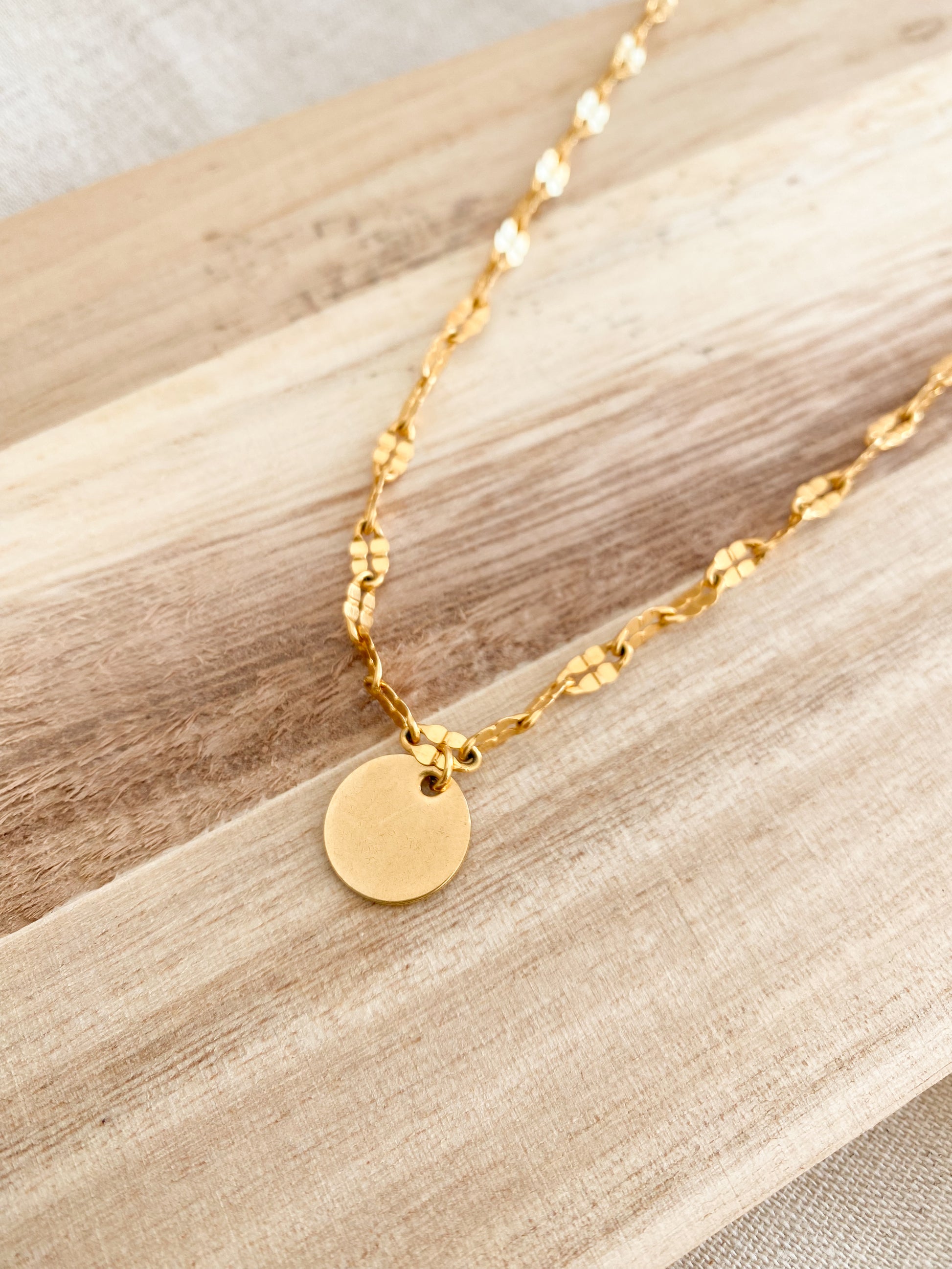 Collier en acier inoxydable, chaîne vintage et pampille ronde.